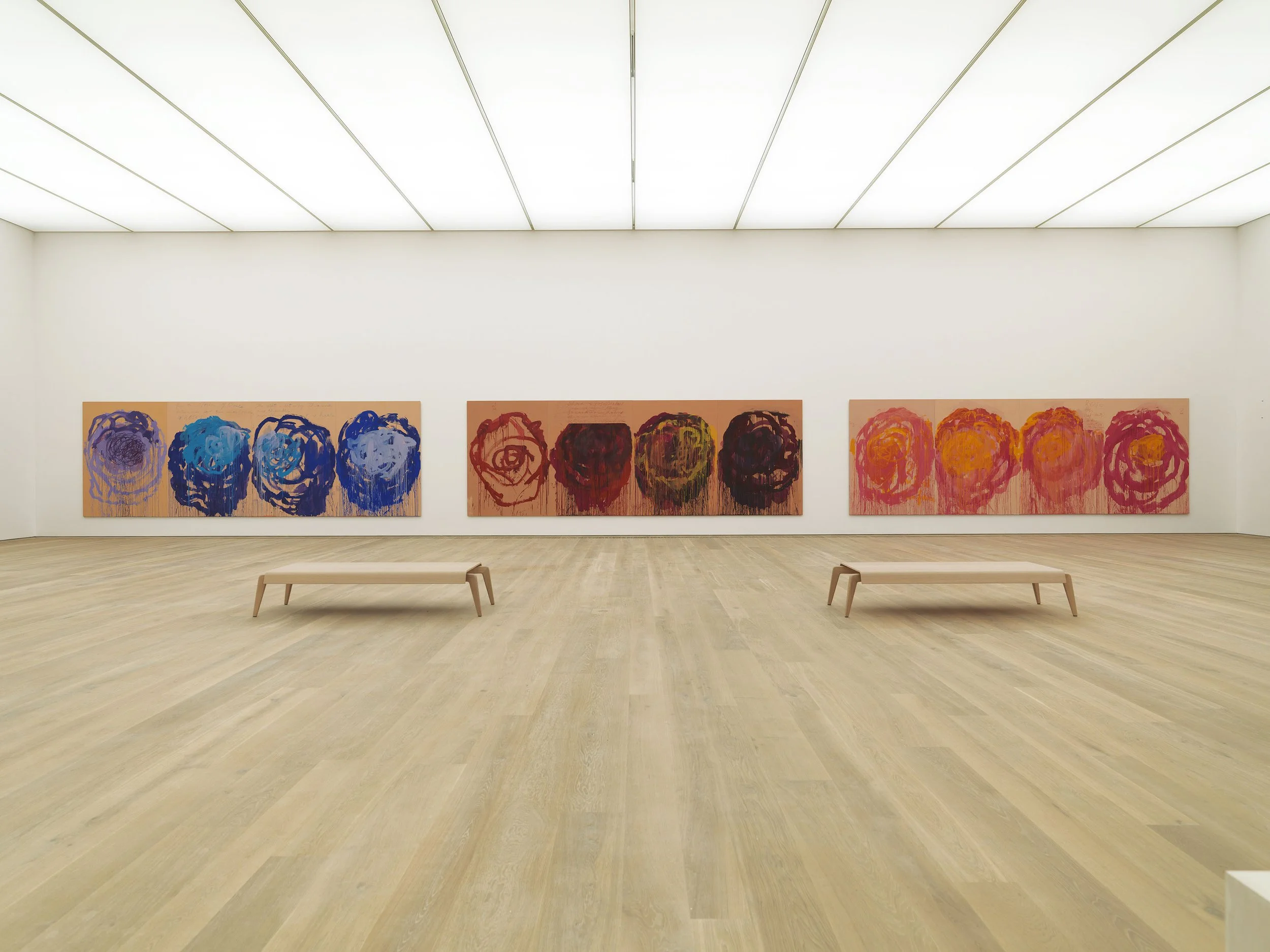 If Lepanto spoke of violence sublimated into abstraction, the Roses series spoke of beauty shadowed by mortality. These large paintings, created in 2008 specifically for Brandhorst, exist in perfect conversation with the architecture that houses them.