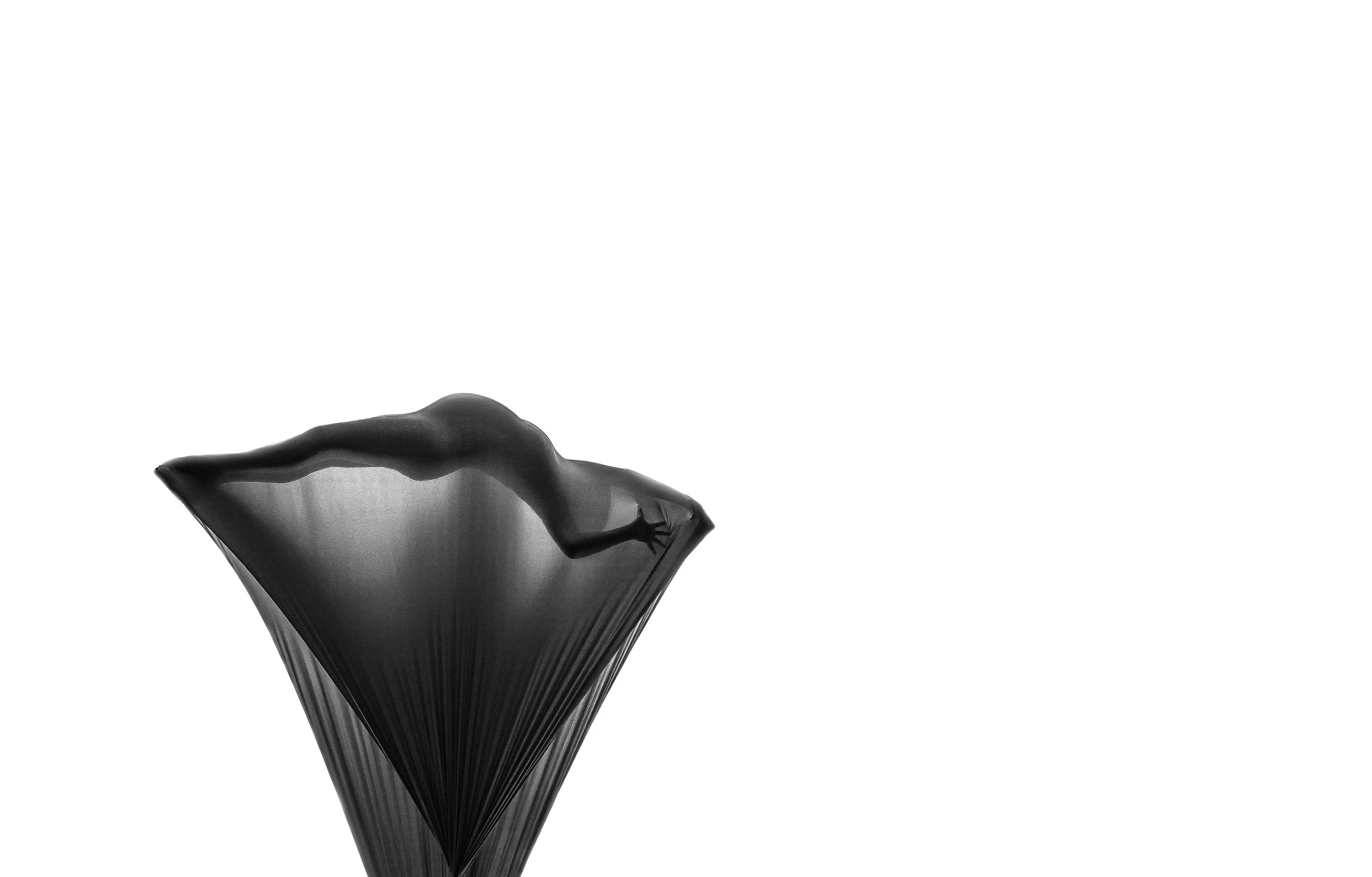 "The ‘Black Tulip’ epitomizes the notion of birth, documents the formation of life, and explores the crystallization of ideas and messages through bodily shapes elegantly shrouded from the naked eye. A translucent piece of fabric represents the frontier that symbolically separates the viewer from the fertile female form and its contortions. Each image in the 10-piece series chronicles a stage of body formation, and with it, the blossom of the ‘tulip’ that gradually unfolds through the progressing frames.