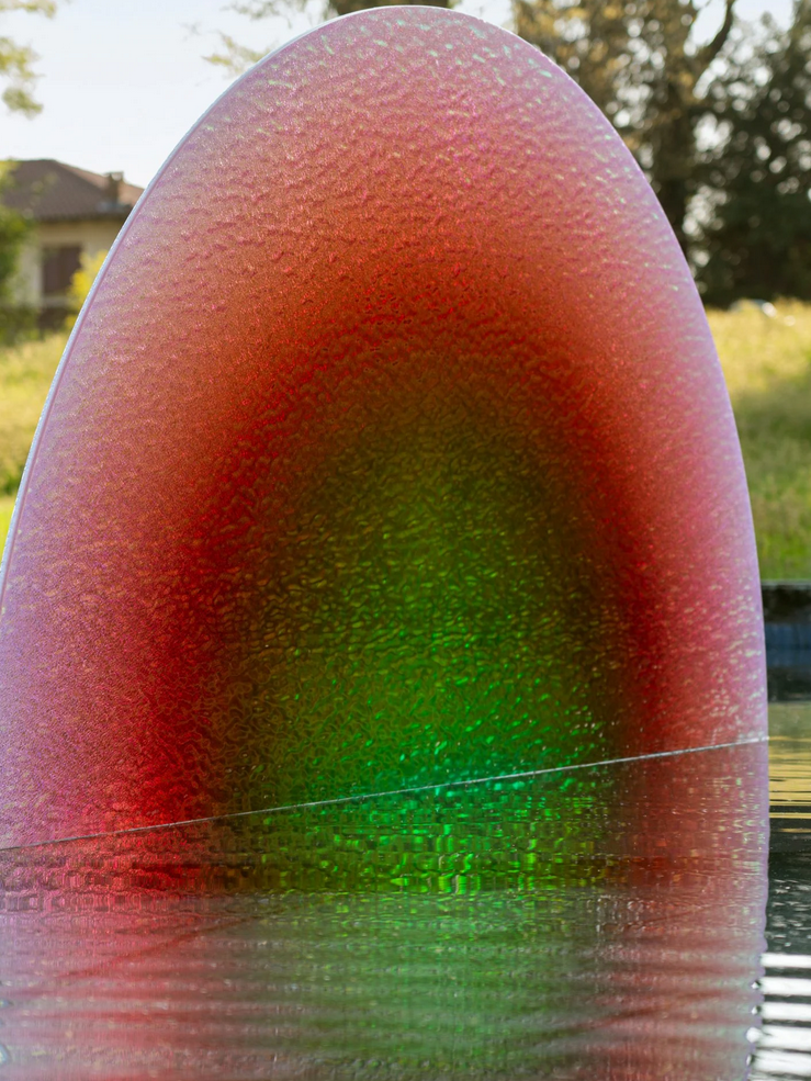 Ruben de la Rive Box and Golnar Roshan have installed a striking solar panel in Villa Bagatti Valsecchi's garden fountain. Sun Catcher was created using technology from SOL R&D, a startup specialising in "aesthetic photovoltaics". Its multicoloured surface appears to change colour as it catches the light in different ways.
