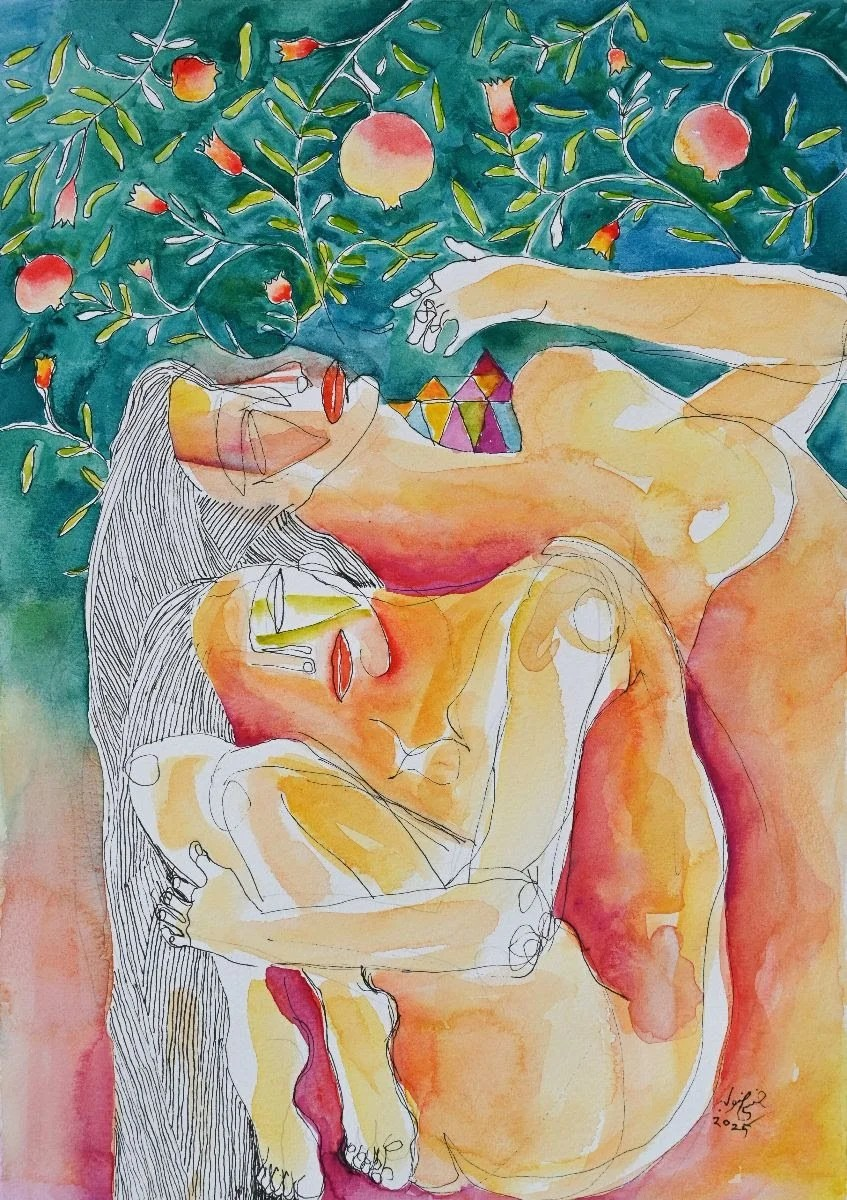 Radwan’s women—often central to his compositions, embody both stillness and motion. Through them, he conveys tenderness and emotional depth, surrounded by vibrant patterns, poetic objects like scattered pomegranates, and rhythmic negative space. His distinctive watercolor technique heightens this lyricism, giving voice to silent narratives and unspoken memories. Throughout his career, Radwan has transformed exile into a wellspring of creativity. His work bridges geographies and histories, weaving personal memory with collective longing. Within the delicate strength of his lines lies the enduring question of belonging—rendered visible in every bend, curve, and gesture of the brush.
